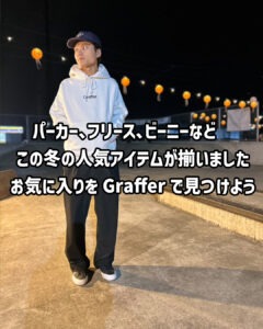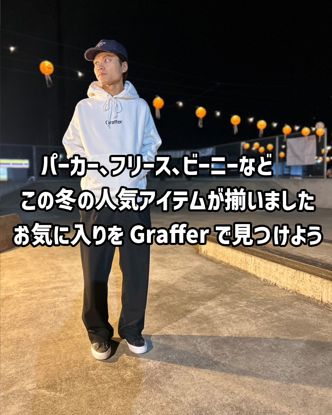 「GRAFFER WINTER 2025」では、パーカーやコーデュロイパンツなど、冬らしい素材感のアイテムが並びます。