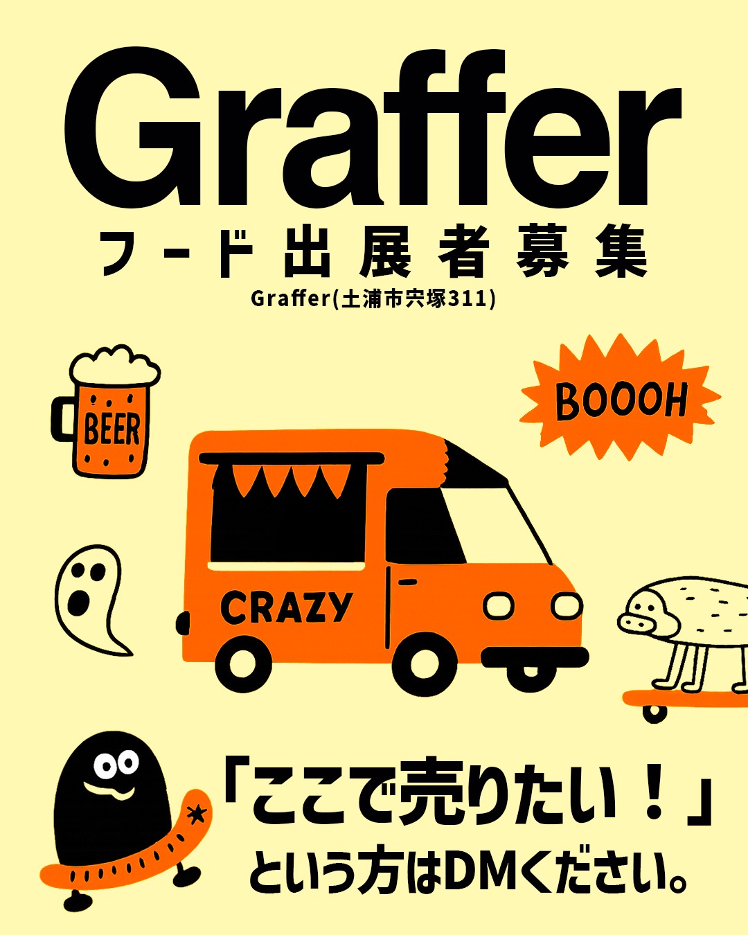 キッチンカー、ケータリング、スイーツ、ドリンク、コーヒー、かき氷など、grafferに遊びに来たお客さんが「思わず立ち寄りたくなる」ような出店であれば大歓迎です。