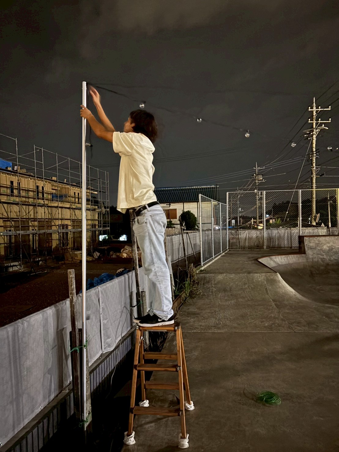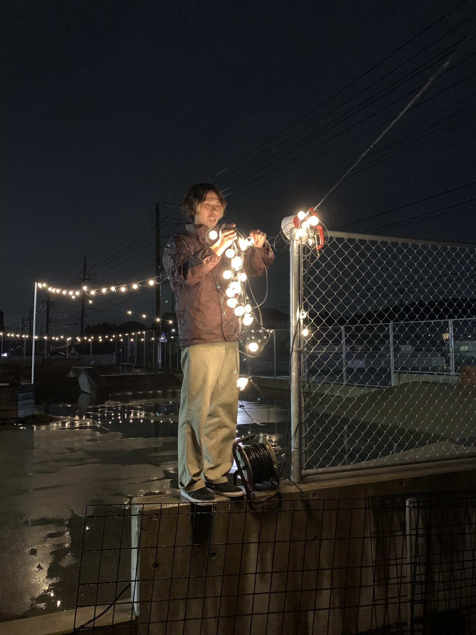 雨が降ったり止んだりする中、照明の位置を決めたり、ポールを立てたり、電源の取り回しを確認したりと、思っていた以上に大変。